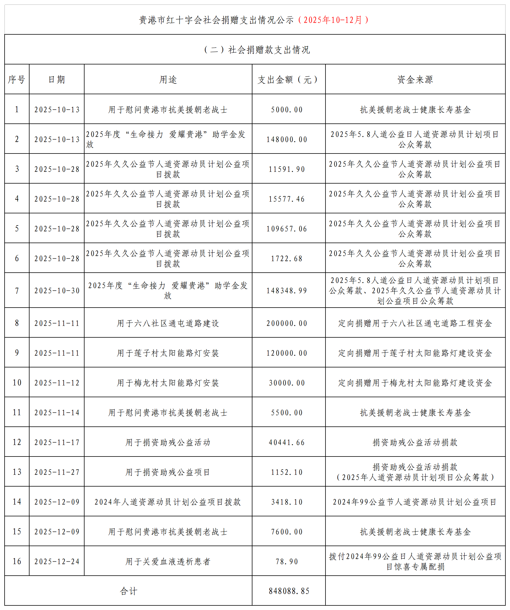 贵港市红十字会社会捐赠支出情况公示(2025年10月至12月)